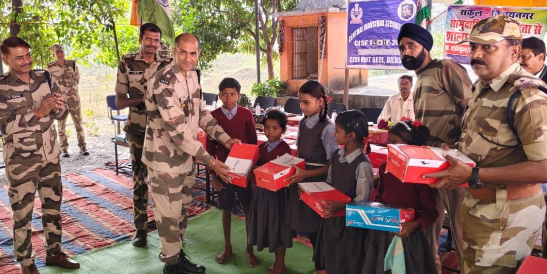 सीआईएसएफ ने किया ग्राम विजयनगर स्कूलों में छात्र छात्राओं को स्टेशनरी व जूते-मोज़े का वितरण।