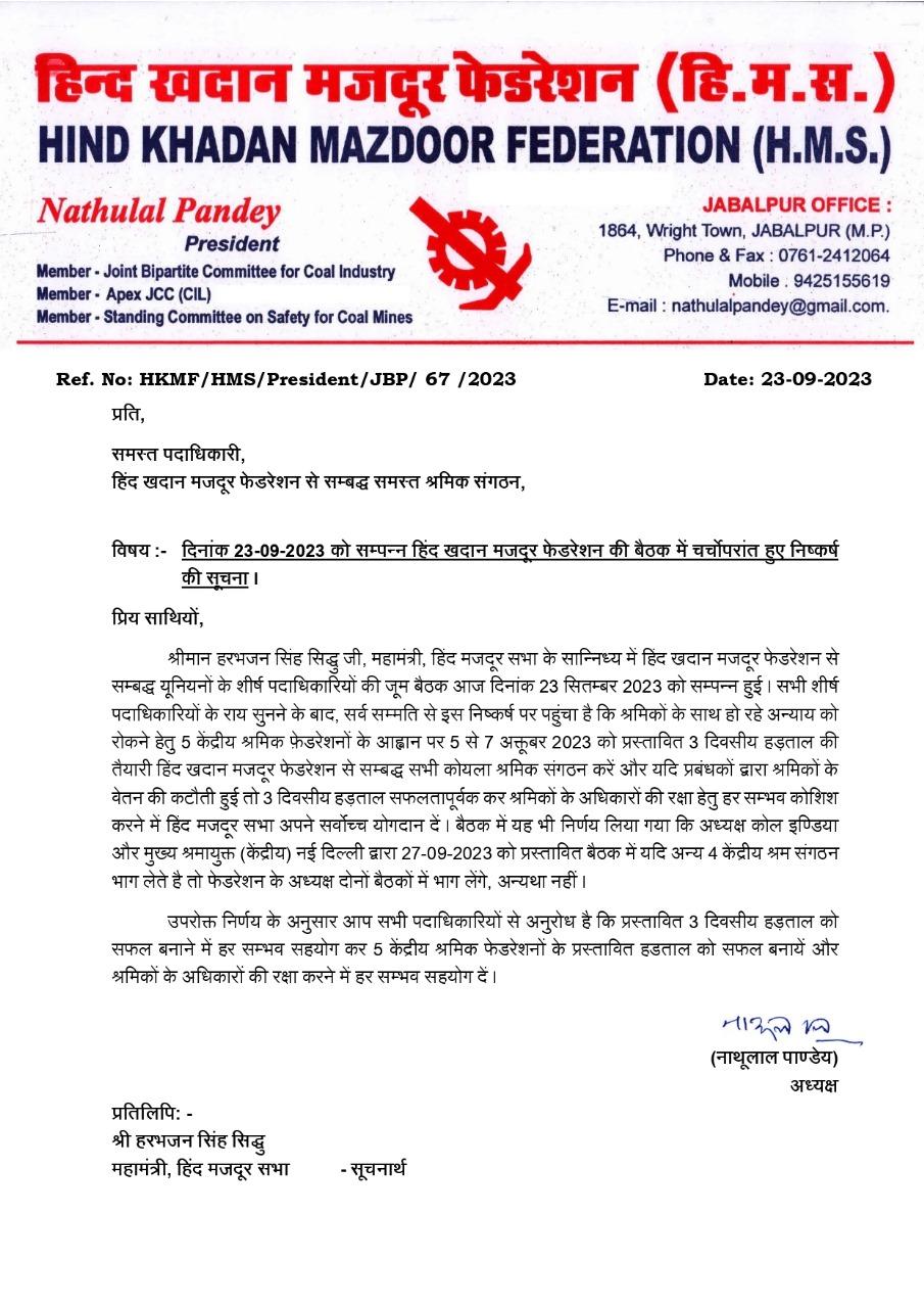 कोलांचल/आगामी 5,6 और 7 अक्टूबर को होने वाले संयुक्त हड़ताल में एचएमएस संगठन भी शामिल रहेगा उक्त बातें हिंद खदान मजदूर फेडरेशन के अध्यक्ष नाथूलाल पांडे ने पत्र जारी कर कहा है।