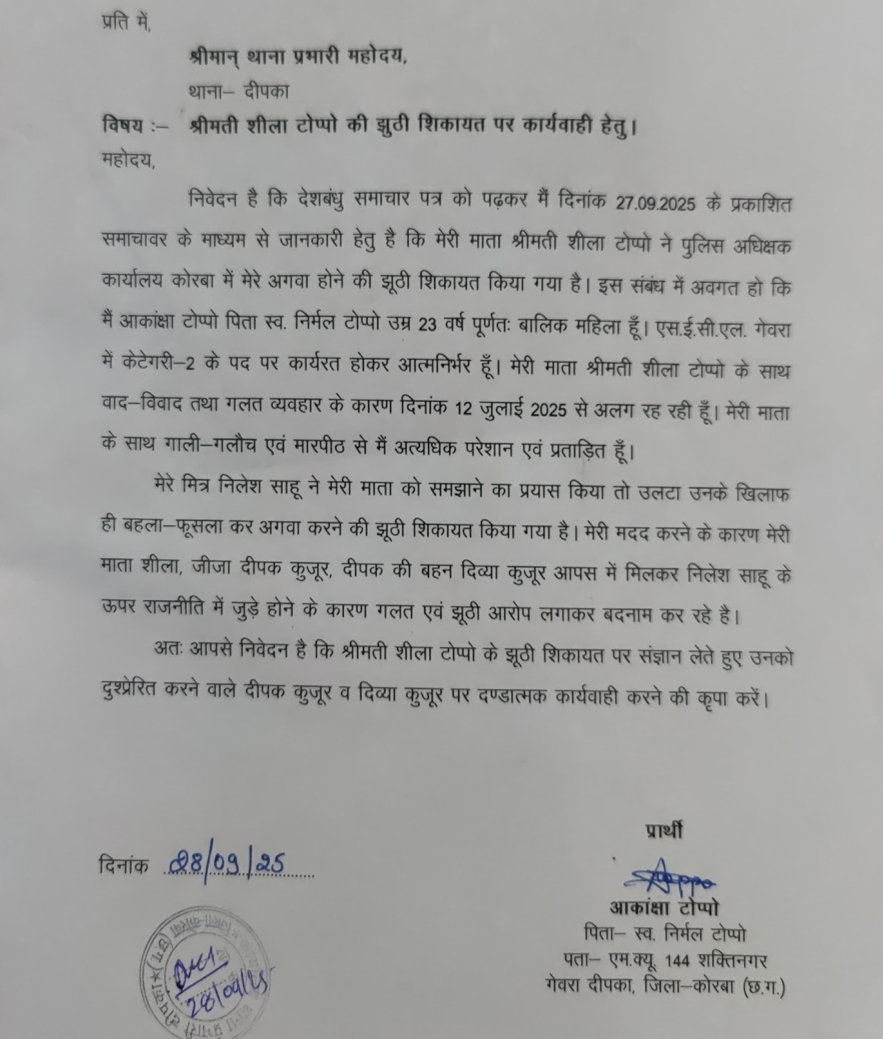 युवती की लिखित सफाई दूसरी ओर, संबंधित युवती ने स्वयं जिला पुलिस अधीक्षक कार्यालय में आवेदन देकर अपनी स्थिति स्पष्ट की है। आवेदन में कहा गया है कि वह एसईसीएल गेवरा में कार्यरत है और अपनी माता के साथ आपसी विवाद एवं घरेलू तनाव के कारण अलग रह रही है।