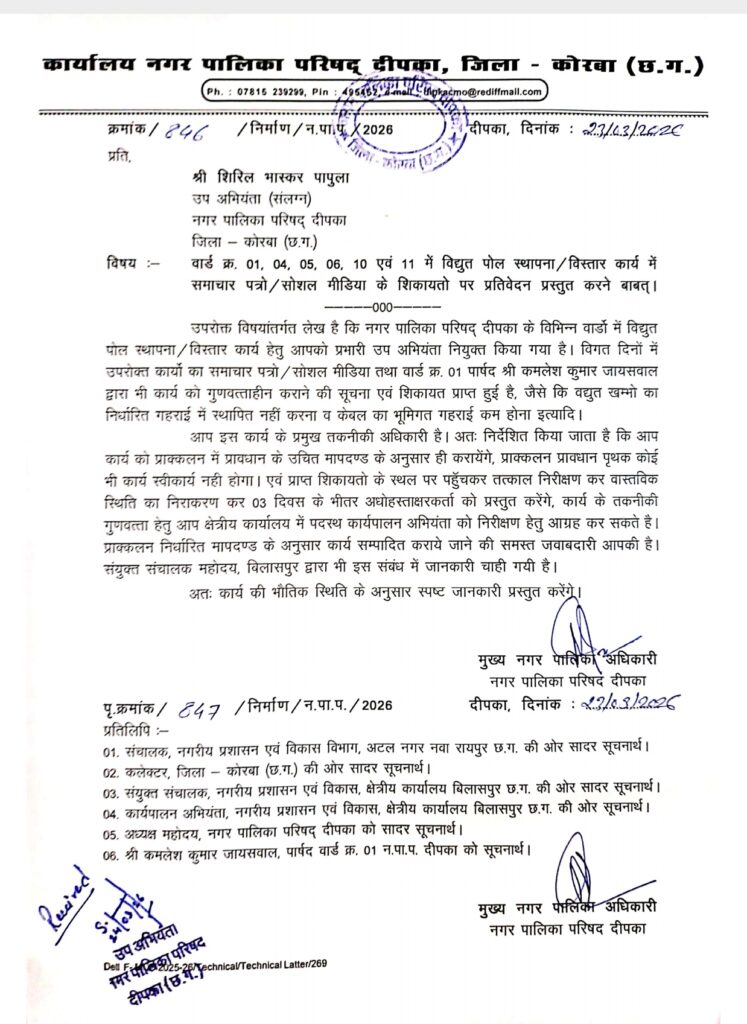 जारी आधिकारिक पत्रों के अनुसार वार्ड क्रमांक 01, 04, 05, 06, 10 एवं 11 में चल रहे विद्युत पोल स्थापना/विस्तार कार्य में निर्धारित मानकों का पालन नहीं करने, केबल की पर्याप्त गहराई नहीं रखने तथा कार्य की गुणवत्ता में कमी को लेकर शिकायतें प्राप्त हुई थीं। ये शिकायतें समाचार पत्रों, सोशल मीडिया और जनप्रतिनिधियों के माध्यम से सामने आईं।